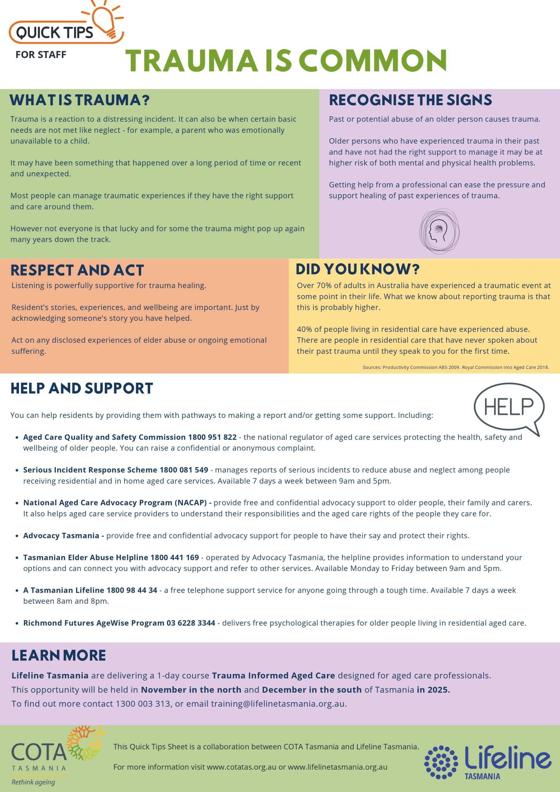 Trauma is a reaction to a distressing incident which can happen at any stage of life.Recognising the signs, showing respect and knowing where to get help and support are great skills to have. In collaboration with Lifeline Tasmania, we have developed a quick tips information sheet. It is targeted toward staff working in residential aged…